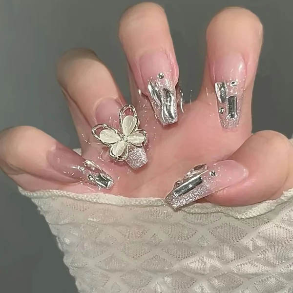 Soyez glamour Avec 24 pièces Moyen Cercueil Papillon 3D Décor À Strass Poudre De Paillettes Faux Ongles & 1 Pièce Lime À Ongles & 1 feuille Ruban